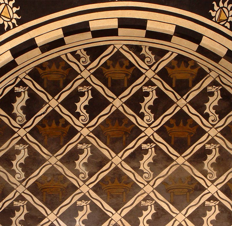 Gino Coppedè: palazzo in piazza Mincio 2: dettaglio delle pareti nell'altrio: cavallucci marini bicromi.