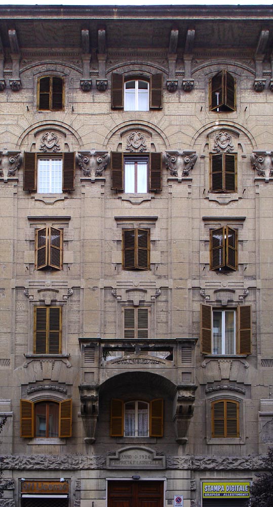 Porzione di facciata dal terzo al quinto piano del palazzo su 6 piani, (piano rialzato e 4 piani più sopraelevazione) in Eclettico, una via di mezzo tra Barocchetto Romano e Liberty situato all'angolo di via Andrea Doria e via Girolamo Savonarola; probabilmente anni 20; il sesto piano è una sopraelevazione fatta non in stile, se pure hanno provato a realizzare una rozza imitazione delle decorazioni dei piani inferiori; nel quartiere vi sono numerosi palazzi con la sopraelevazione.