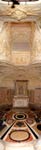 L'interno della cella semi ipogea del tempietto del Bramante; in evidenza gli intarsi marmorei in stile cosmatesco del pavimento, la statua di S. Pietro e gli stucchi con putti che sono sulla volta e sulle pareti; in basso il lucernario che pone in vista la cripta sul cui suolo sarebbe stata piantata la croce di Pietro; in alto un altro lucerenario mette in comunicazione la chiesetta al piano superiore con questo ambiente.